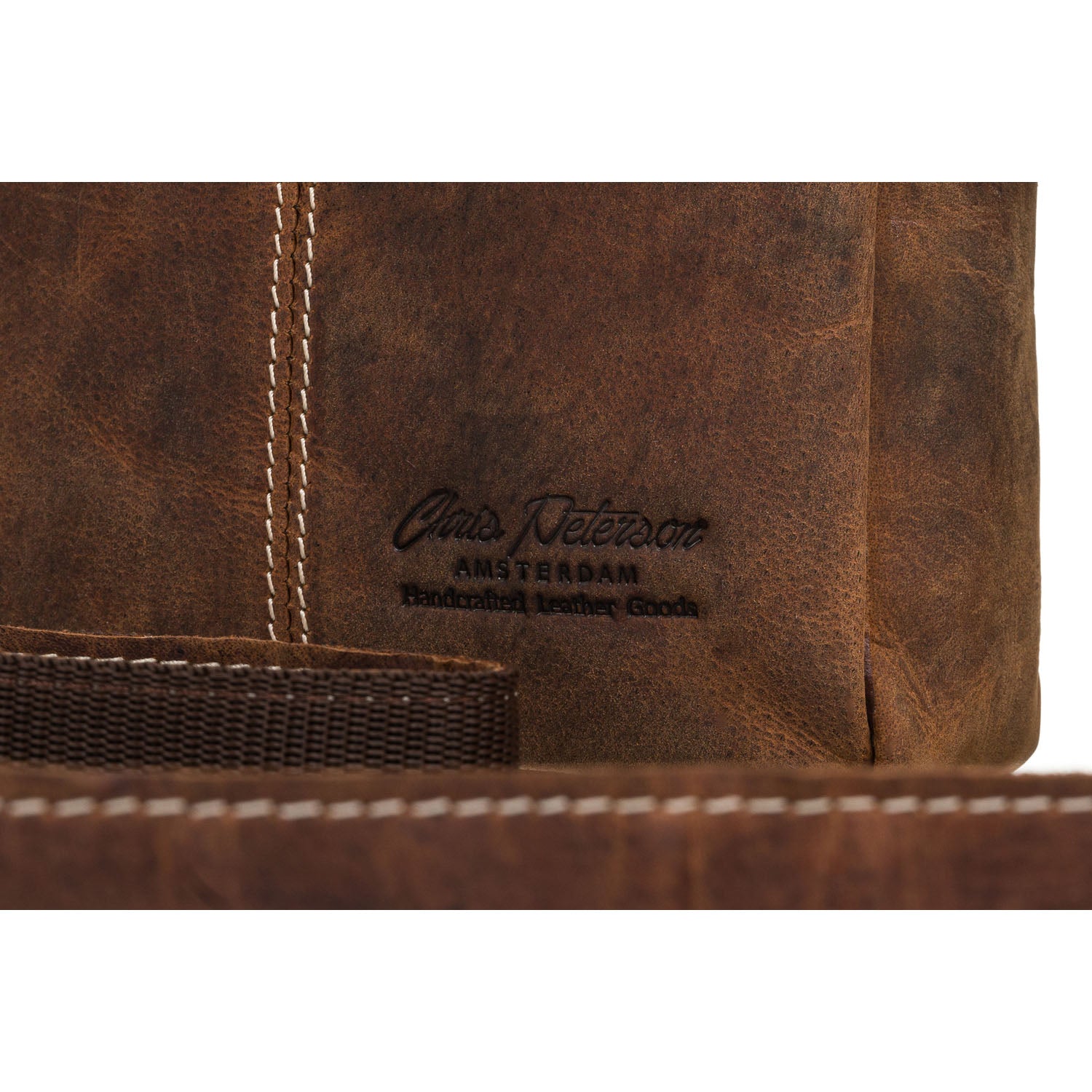 Peterson vīriešu soma no dabīgas ādas, brūnā krāsā, ar vienu nodalījumu un piecām kabatām. Regulējama siksna līdz 155 cm.