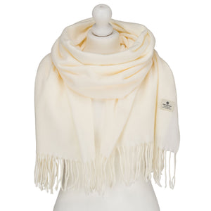 Baltā Peterson šalle no 100% poliestera – lieliski piemērota rudens, ziemas un pavasara sezonai.