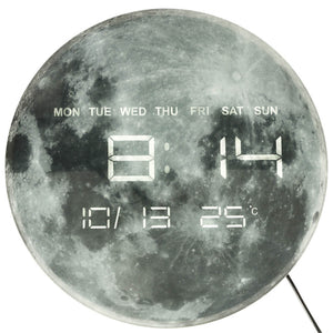 Pulkstenim nav jābūt garlaicīgam — šis noteikti izcelsies! Mēness grafika ir pievilcīga un pārvērš funkcionālo ierīci par unikālu interjera akcentu. Elektroniskais displejs rāda tādu informāciju kā: precīzs laiks (12/24 h), datums (M/D/M), nedēļas diena (angļu valodā) un pašreizējā istabas temperatūra. Kad pulkstenis ir iestatīts, nedēļas dienas marķieris nepārtraukti mirgos. To var piekārt pie sienas vai novietot uz komplektā iekļautajiem statīviem. Pulkstenim jābūt pastāvīgi pievienotam strāvas avotam (strāvas kabelis ir iekļauts komplektā). CR3023 baterija (iekļauta komplektā) saglabā saglabātos datus īslaicīgu strāvas padeves pārtraukumu laikā.