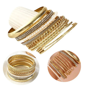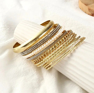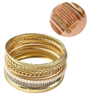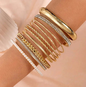 Šis rokassprādžu komplekts ir lieliska izvēle tiem, kas novērtē eleganci un daudzpusību. Komplektā ietilpst 10 stilīgas rokassprādzes, kas viegli pieguļ plaukstas locītavai.