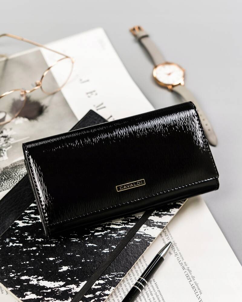 Šis elegantais sieviešu maks no 4U Cavaldi ir lieliska izvēle tiem, kas meklē stilīgu un funkcionālu aksesuāru. Izgatavots no augstas kvalitātes īstas un lakotas ādas, tas ne tikai izskatās grezni, bet arī nodrošina izturību. Melnā krāsa nodrošina daudzpusību, tāpēc maks lieliski piestāvēs dažādiem apģērba stiliem. Pateicoties integrētajai RFID aizsardzībai, jūsu kartes būs pasargātas no nevēlamas skenēšanas. Ērtais karšu un monētu nodalījumu izkārtojums atvieglos jūsu finanšu organizēšanu.