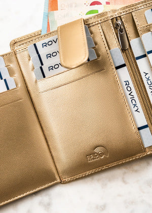 Šis elegantais un funkcionālais sieviešu maks no Rovicky ir izgatavots no augstas kvalitātes īstas ādas. Tā zelta krāsa piešķir greznības sajūtu, un lielais izmērs nodrošina pietiekami daudz vietas visām jūsu mantām. Makam ir arī RFID aizsardzība, kas palīdz aizsargāt jūsu kartes no neatļautas skenēšanas. Ar vairāk nekā 10 karšu nodalījumiem šis maks ir lieliska izvēle sievietēm, kuras novērtē stilu un drošību.