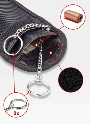 Ja jums ir automašīna ar bezatslēgas piekļuves sistēmu, šis maciņš ir lieliska izvēle. Tas apgrūtina zagļiem jūsu atslēgas signāla nolasīšanu un pārtveršanu. Maciņa korpuss ir izgatavots no īpaša materiāla, kas bloķē signālus. Ievietojot atslēgu zelta slotā, signāli netiks izstaroti apkārtējā vidē. Mikrošķiedras materiāls iekšpusē atstaro radioviļņus, neļaujot tiem iekļūt maciņā.