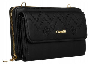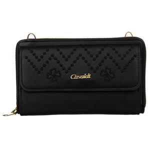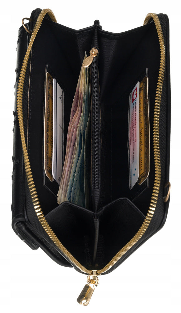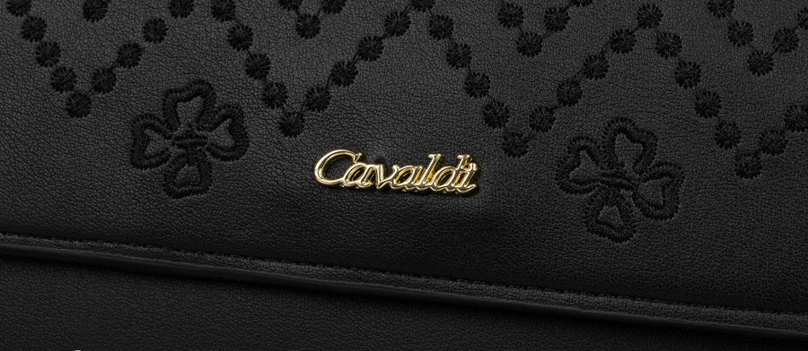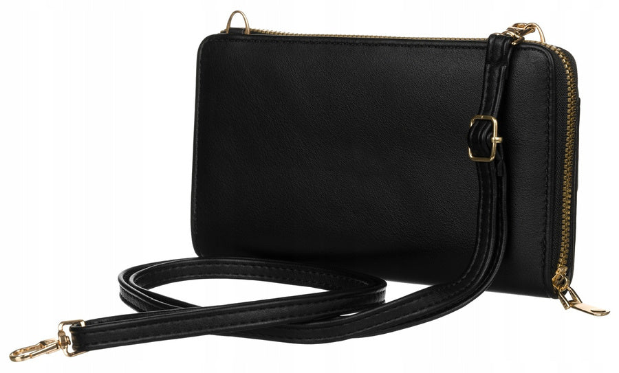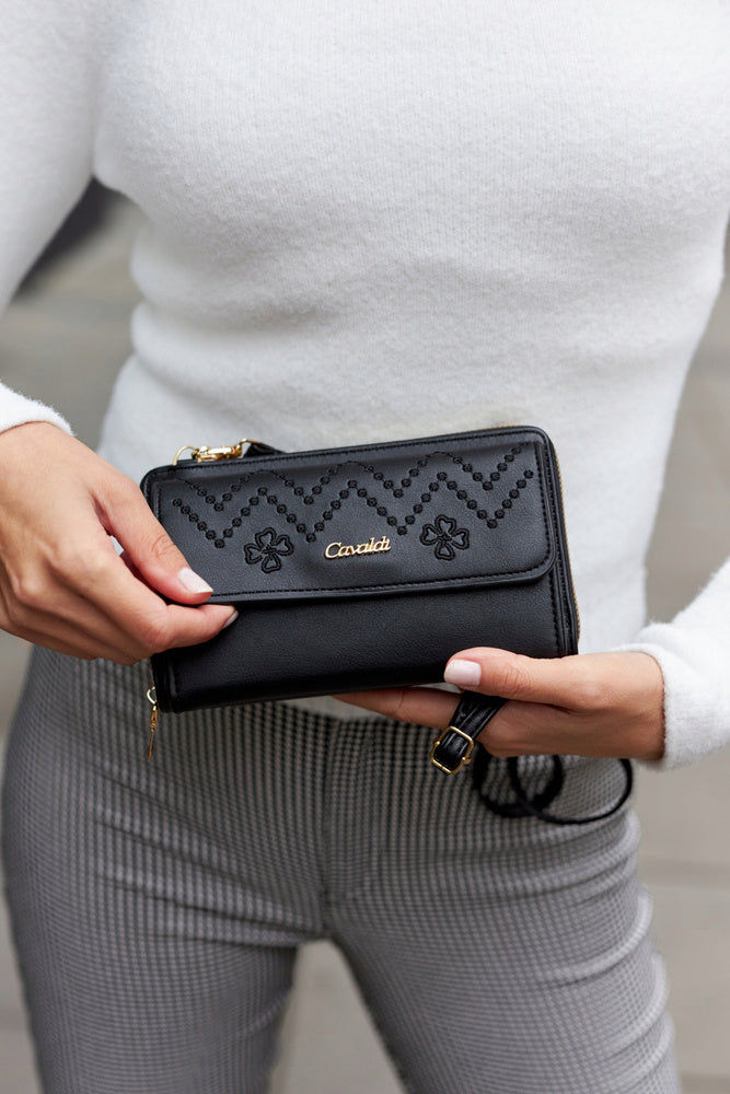 4U CAVALDI sieviešu rokassoma no organiskās ādas, melnā krāsā, ar rāvējslēdzēju un ielocēm.