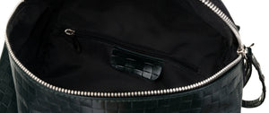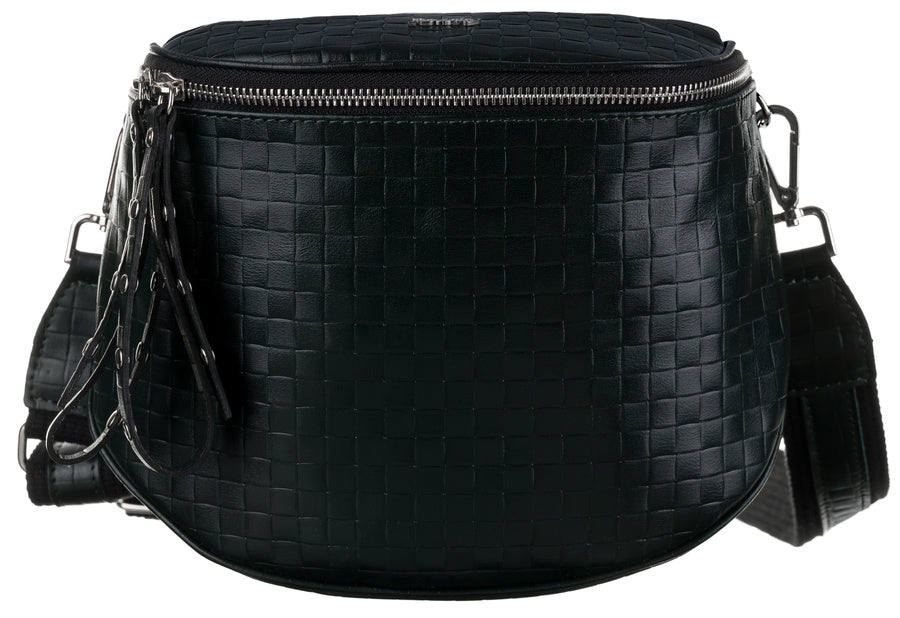 Šī elegantā rokassoma ir izgatavota no augstas kvalitātes īstas ādas, kas nodrošina izturību un stilīgu izskatu. Rokassomas pamatkrāsa ir tumši zaļa, piešķirot tai neuzkrītošu greznības sajūtu.
