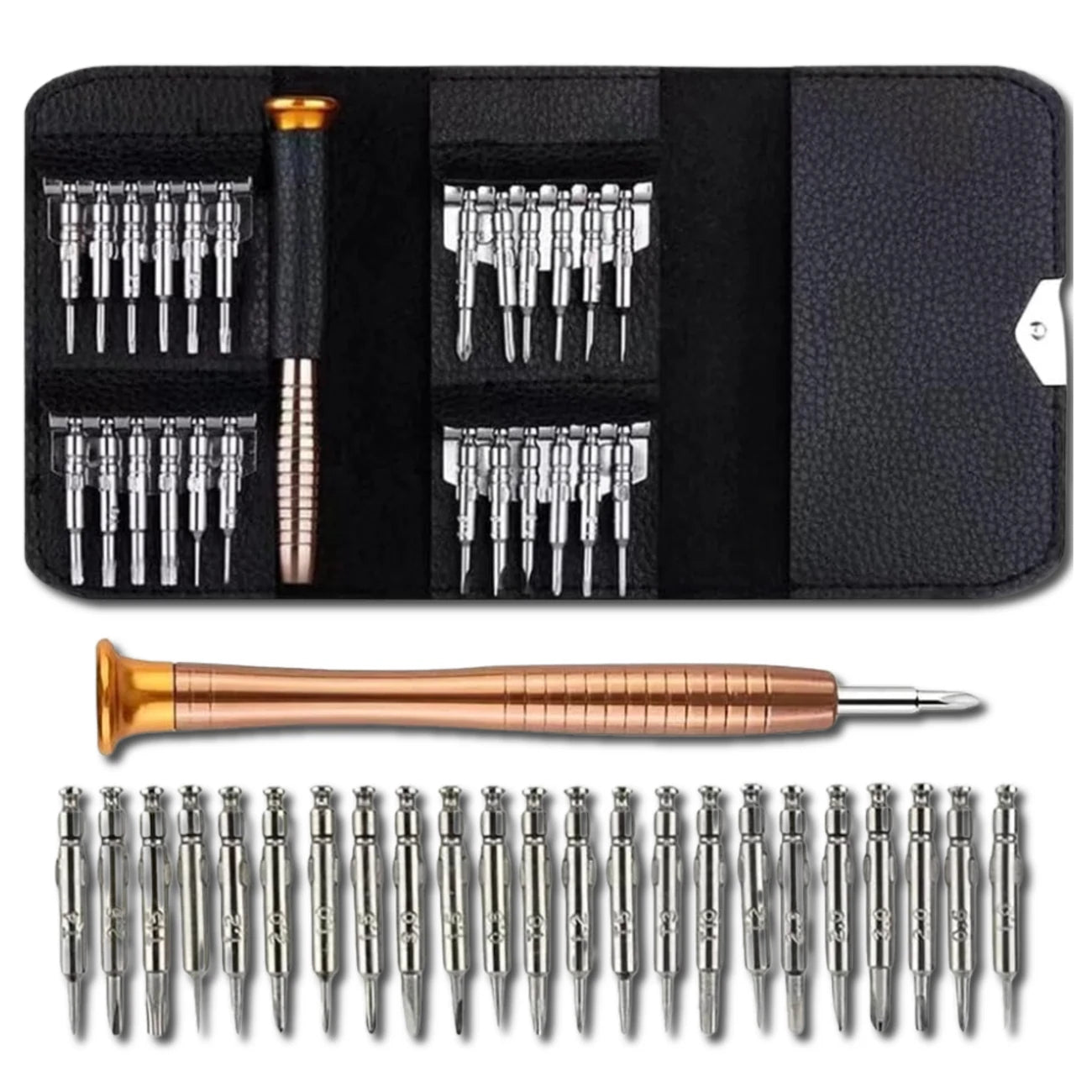 - Komplektā ietilpst 24 maināmi uzgaļi, tostarp TORX, plakanie, krustveida, Y veida un trīs leņķu uzgaļi.