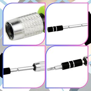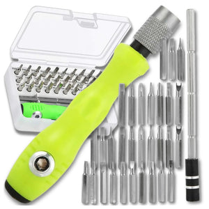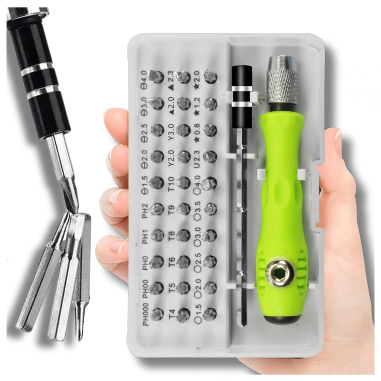 Krāsa un unikālas īpašības: Komplektā ietilpst 30 dažādi maināmi uzgaļi, tostarp TORX, plakanie, krustveida, Y veida, trīsstūrveida, sešstūra un speciālie skrūvgrieži. Visi instrumenti ir ērti glabāti speciālā kastītē, kas atvieglo to uzglabāšanu un transportēšanu.