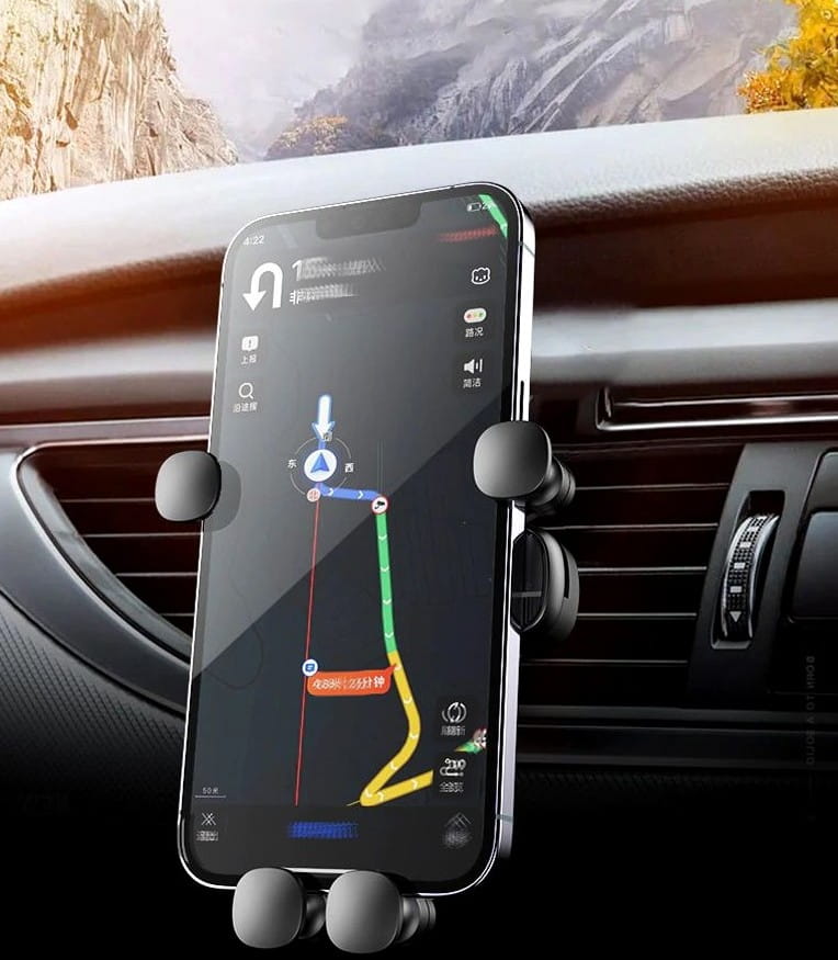Moderns un elegants telefona turētājs, kas darbojas pēc gravitācijas principa, nodrošinot ērtu un drošu lietošanu automašīnā.