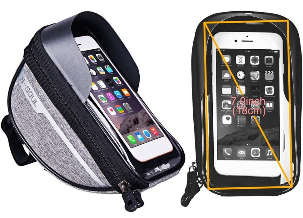 Ūdensizturīga velosipēda soma ar tālruņa turētāju ērtai un drošai mantu glabāšanai riteņbraukšanas laikā.