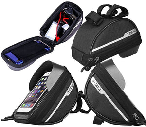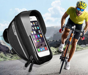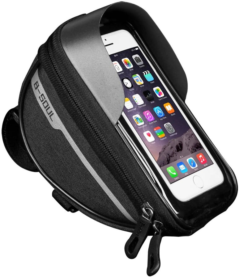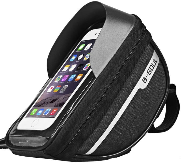 Ūdensizturīga velosipēda soma ar integrētu tālruņa turētāju ērtai un drošai lietošanai ceļojuma laikā.