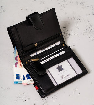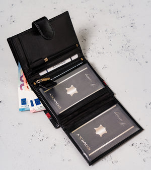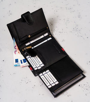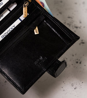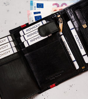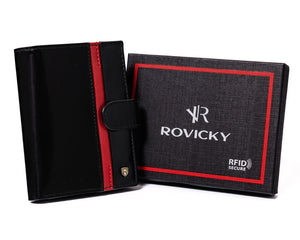 Vīriešu ādas maks Rovicky RV112 ir elegants un funkcionāls aksesuārs, kas izgatavots no augstas kvalitātes īstas ādas. Melnās un sarkanās krāsas kombinācija piešķir tam ekskluzivitāti, un lielais izmērs nodrošina pietiekami daudz vietas visām jūsu vajadzībām. Makam ir 6-10 karšu nodalījumi, un tas ir aprīkots ar RFID aizsardzību, kas palīdz aizsargāt jūsu personas datus no neatļautas skenēšanas. Izmēri 13 cm x 10 cm x 2,5 cm ļauj ērti uzglabāt maku kabatā vai somā.