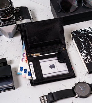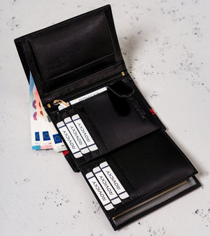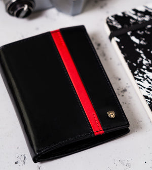 Šis maks ne tikai glabā visas jūsu kartes, bet arī aizsargā tās no nevēlamas skenēšanas, pateicoties iebūvētajai RFID aizsardzībai. Izvēlieties vienu no divām klasiskām krāsām — melnu un sarkanu — un izbaudiet funkcionalitāti un stilu katru dienu.