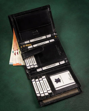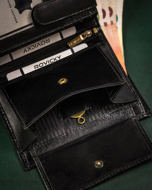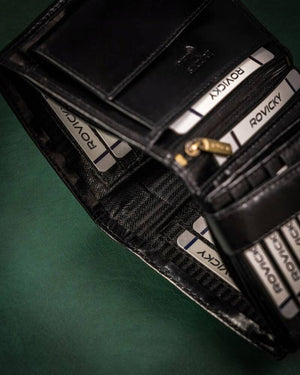 Šis elegantais vīriešu maks no Rovicky ir izgatavots no augstas kvalitātes īstas ādas, kas nodrošina izturību un stilīgu izskatu. Melnā krāsa piešķir tam klasisku un daudzpusīgu izskatu, kas piemērots jebkuram gadījumam.