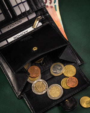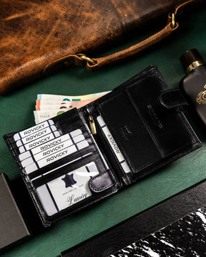 Šis elegantais vīriešu maks no Rovicky ir izgatavots no augstas kvalitātes īstas ādas, kas nodrošina izturību un stilīgu izskatu. Melnā krāsa piešķir tam klasisku un daudzpusīgu izskatu, kas piemērots jebkuram gadījumam.