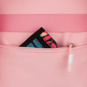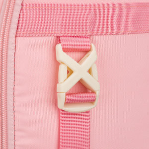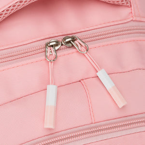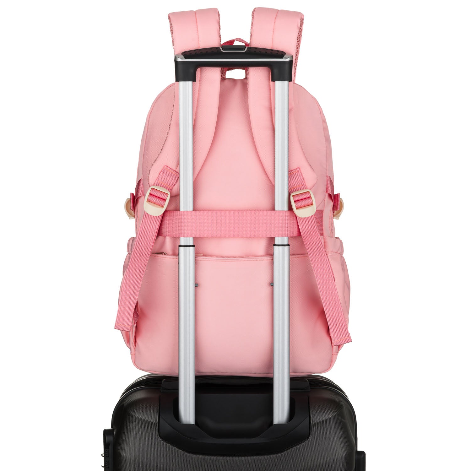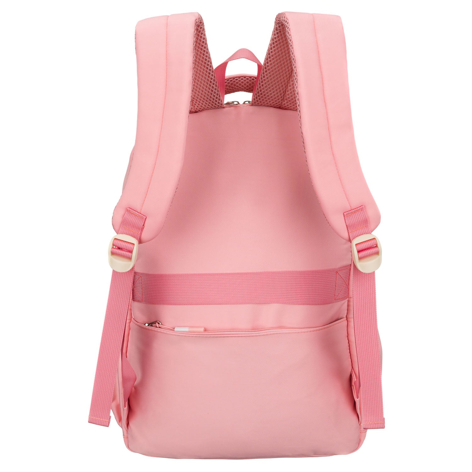 Peterson rozā liela mugursoma ar diviem nodalījumiem un sešām kabatām, izgatavota no poliestera.