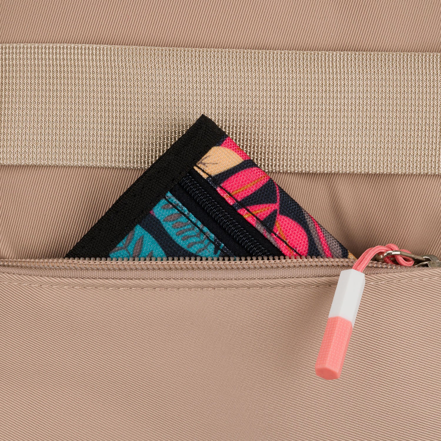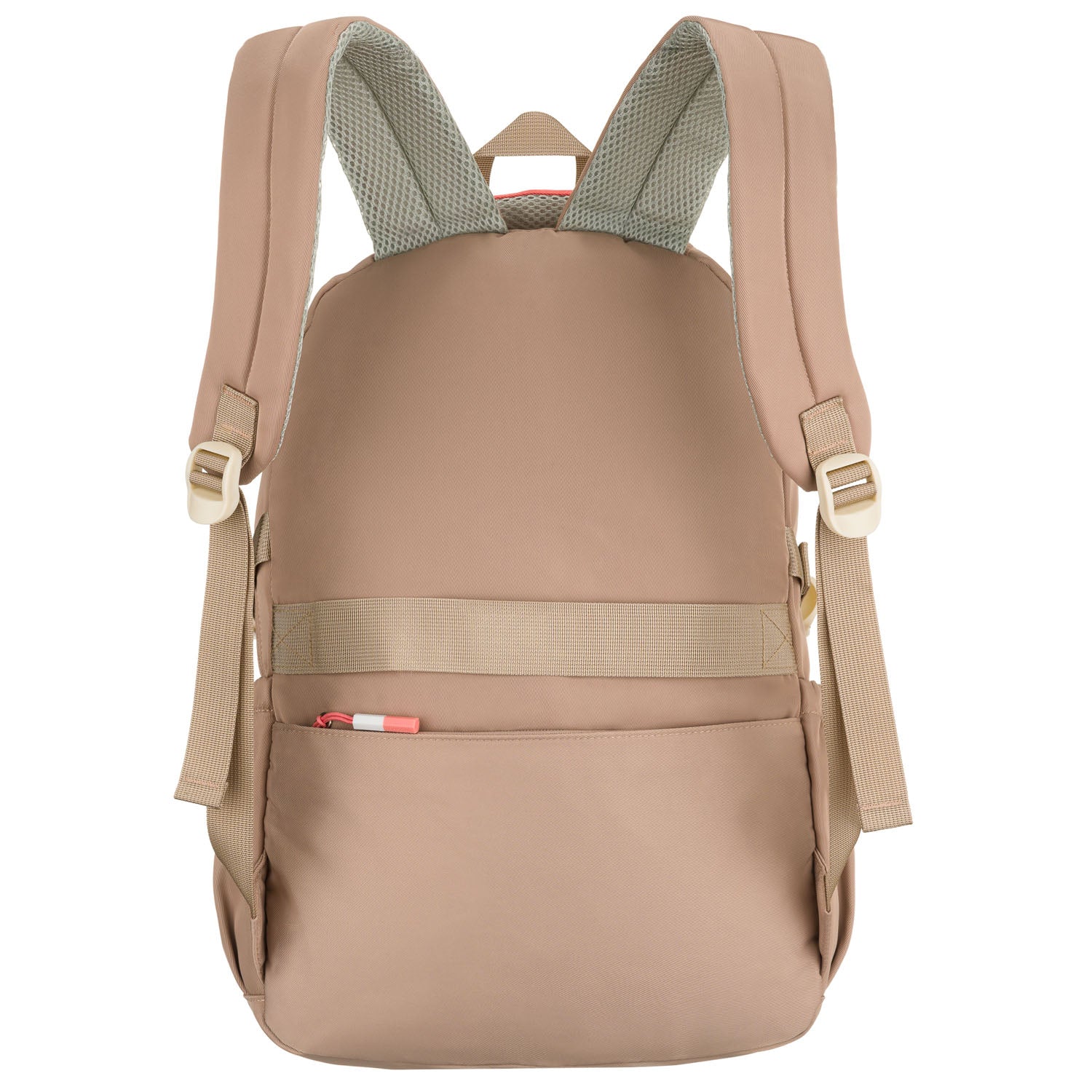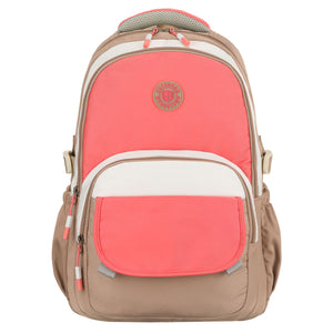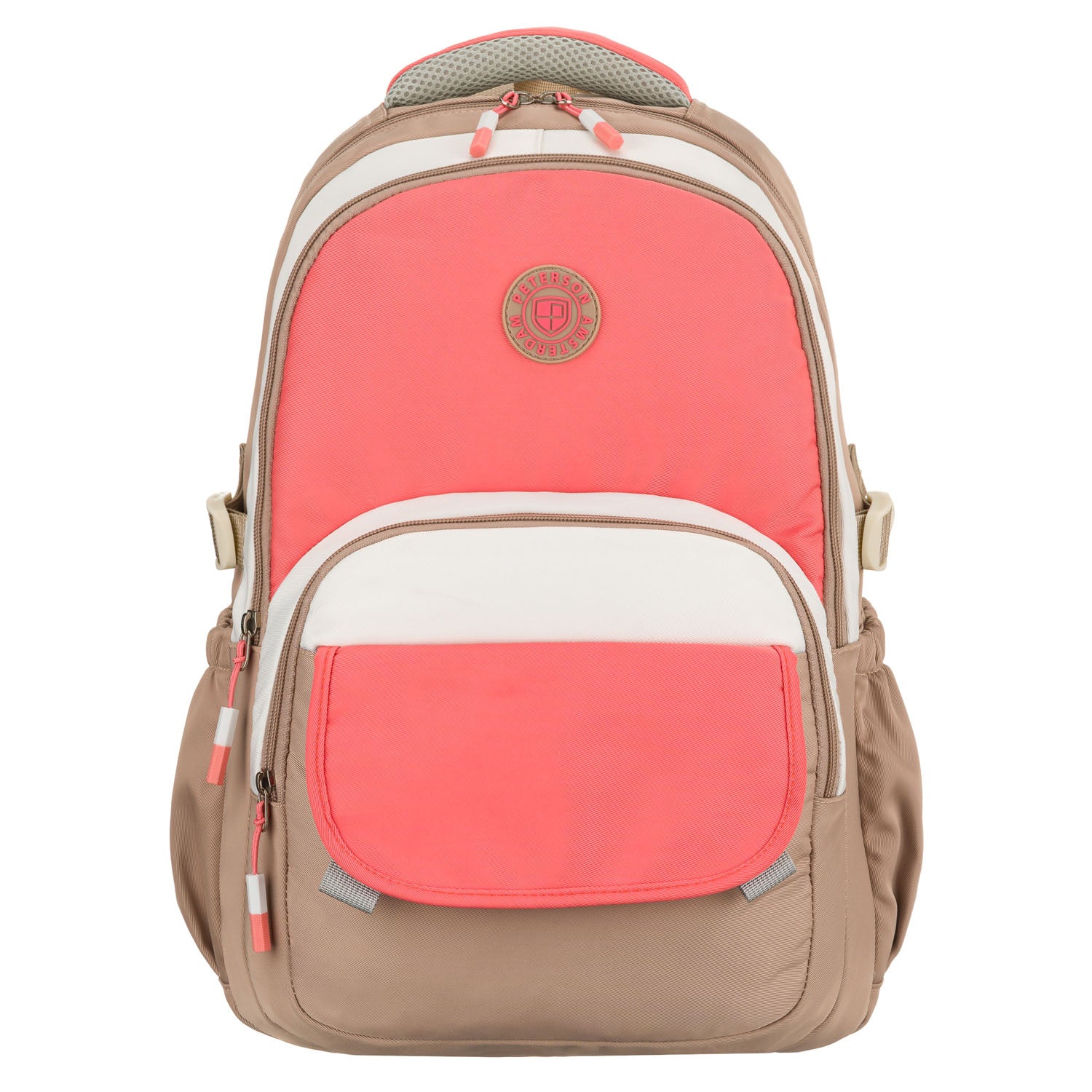 Peterson liela rozā poliestera mugursoma ar diviem nodalījumiem un sešām kabatām, kas lieliski piemērota ikdienas lietošanai.