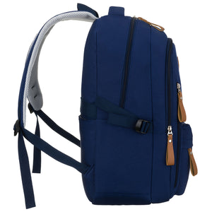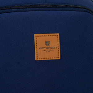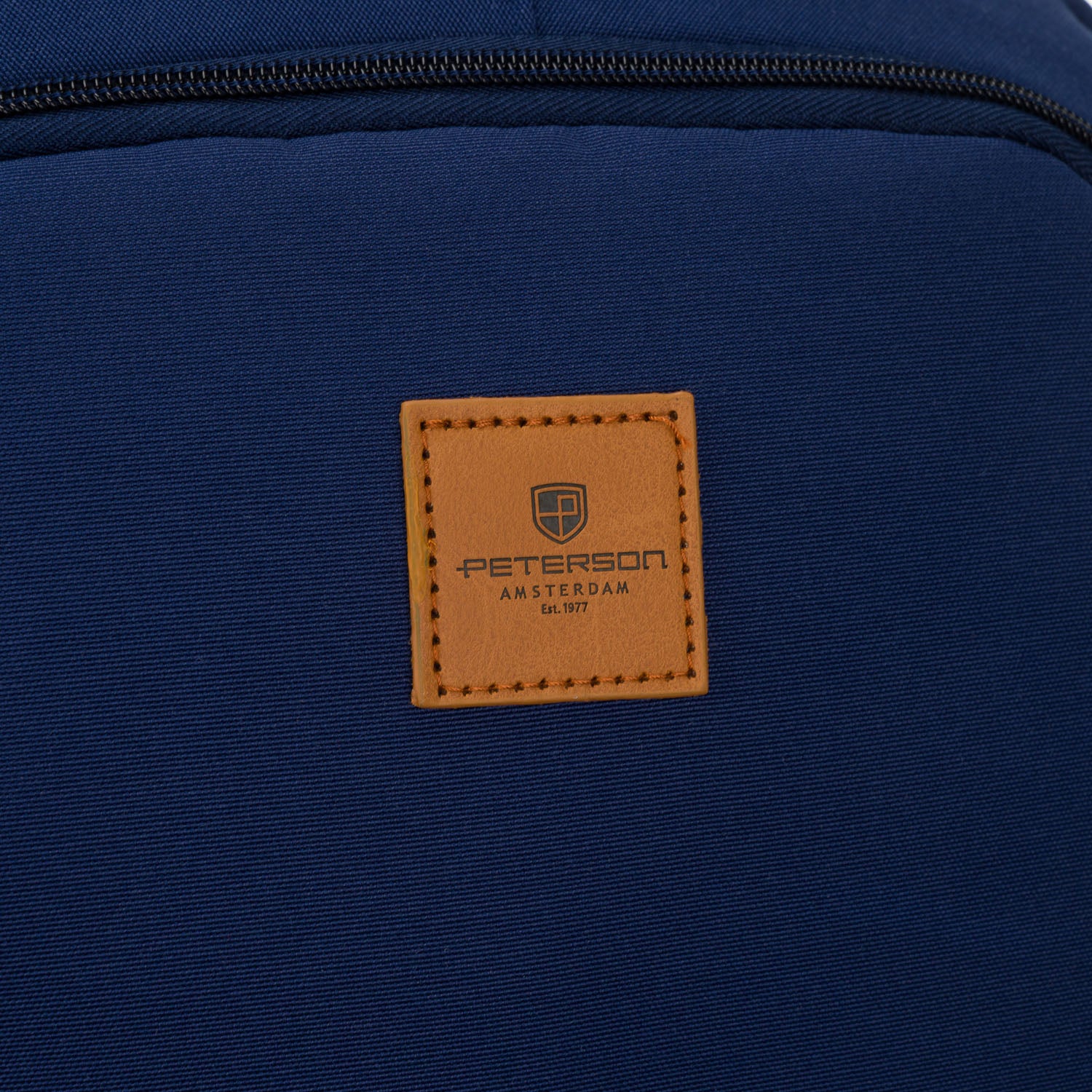 Peterson liela, tumši zila mugursoma ar diviem nodalījumiem un sešām kabatām, izgatavota no poliestera.