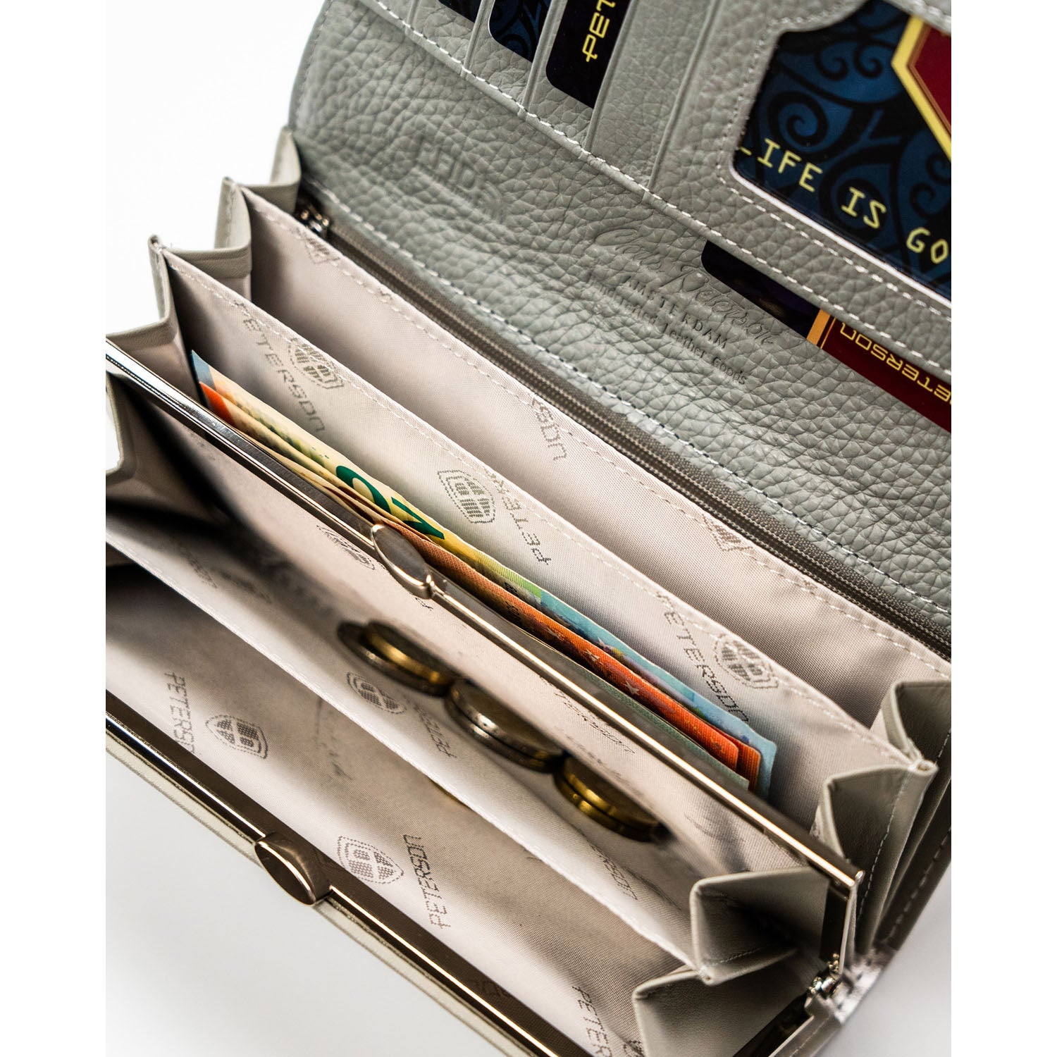 - 6-10 karšu nodalījumi un kabata monētām ar rāvējslēdzēju.