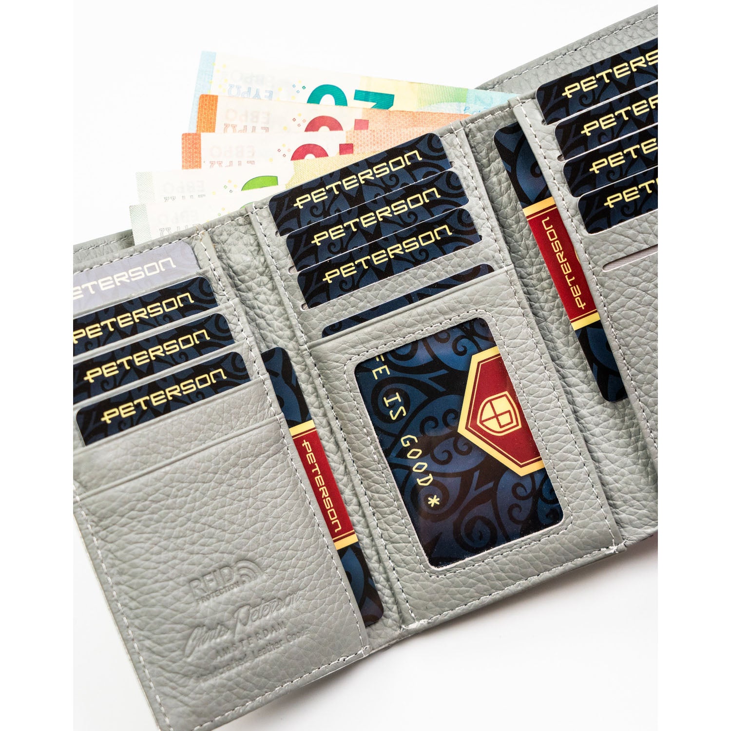 - Vairāk nekā 10 karšu nodalījumi un kabata monētām ar rāvējslēdzēju