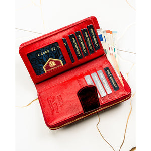 Peterson sarkans sieviešu maks - eleganta izvēle ar RFID aizsardzību.