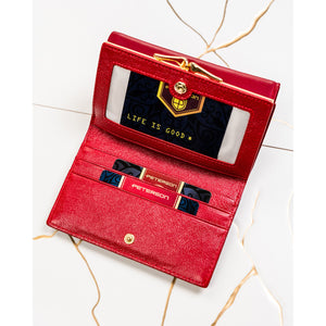 Elegants sarkans Peterson sieviešu maks, kas izgatavots no mākslīgās ādas ar RFID aizsardzību.