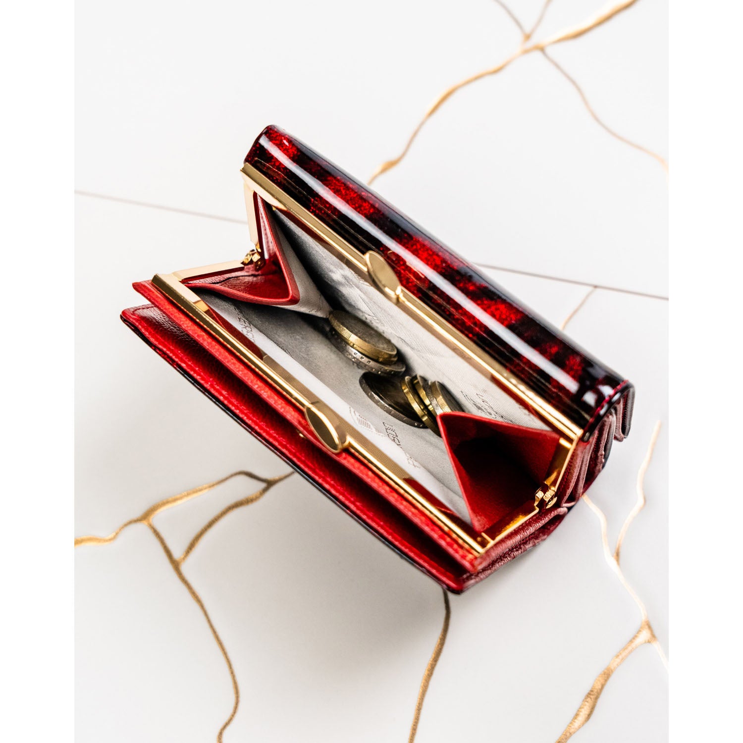 Sarkans Peterson sieviešu maks, kas izgatavots no mākslīgās ādas ar RFID aizsardzību.