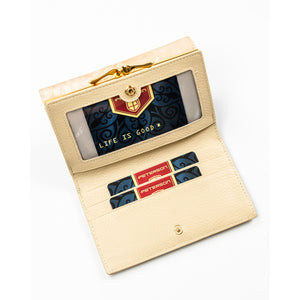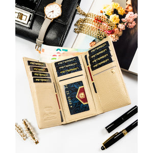 Peterson sieviešu maks, kas izgatavots no mākslīgās ādas, bēšā krāsā, ar vairāk nekā 10 karšu nodalījumiem.