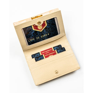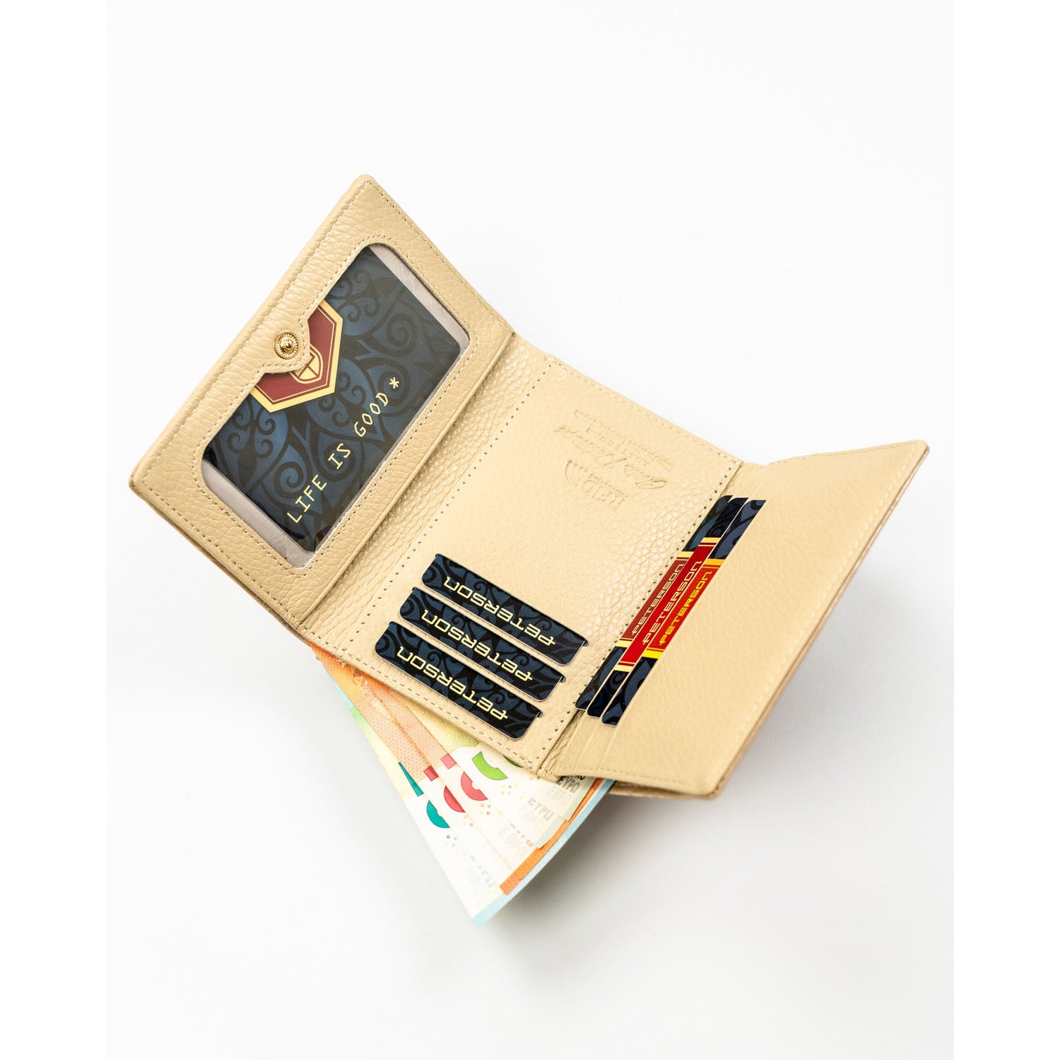 Peterson sieviešu maks, izgatavots no mākslīgās ādas, bēšā krāsā, ar 6-10 karšu nodalījumiem.