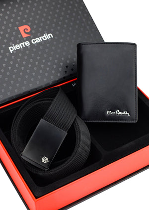 PIERRE CARDIN • Vīriešu dāvanu komplekts Q1 • Āda • RFID • Maks (VERTIKĀLS) + josta 135 cm • Sertifikāts