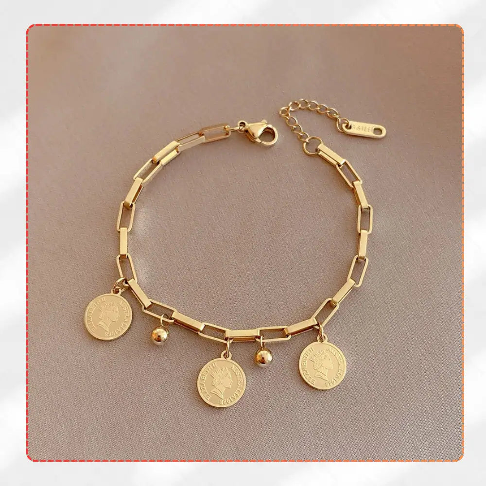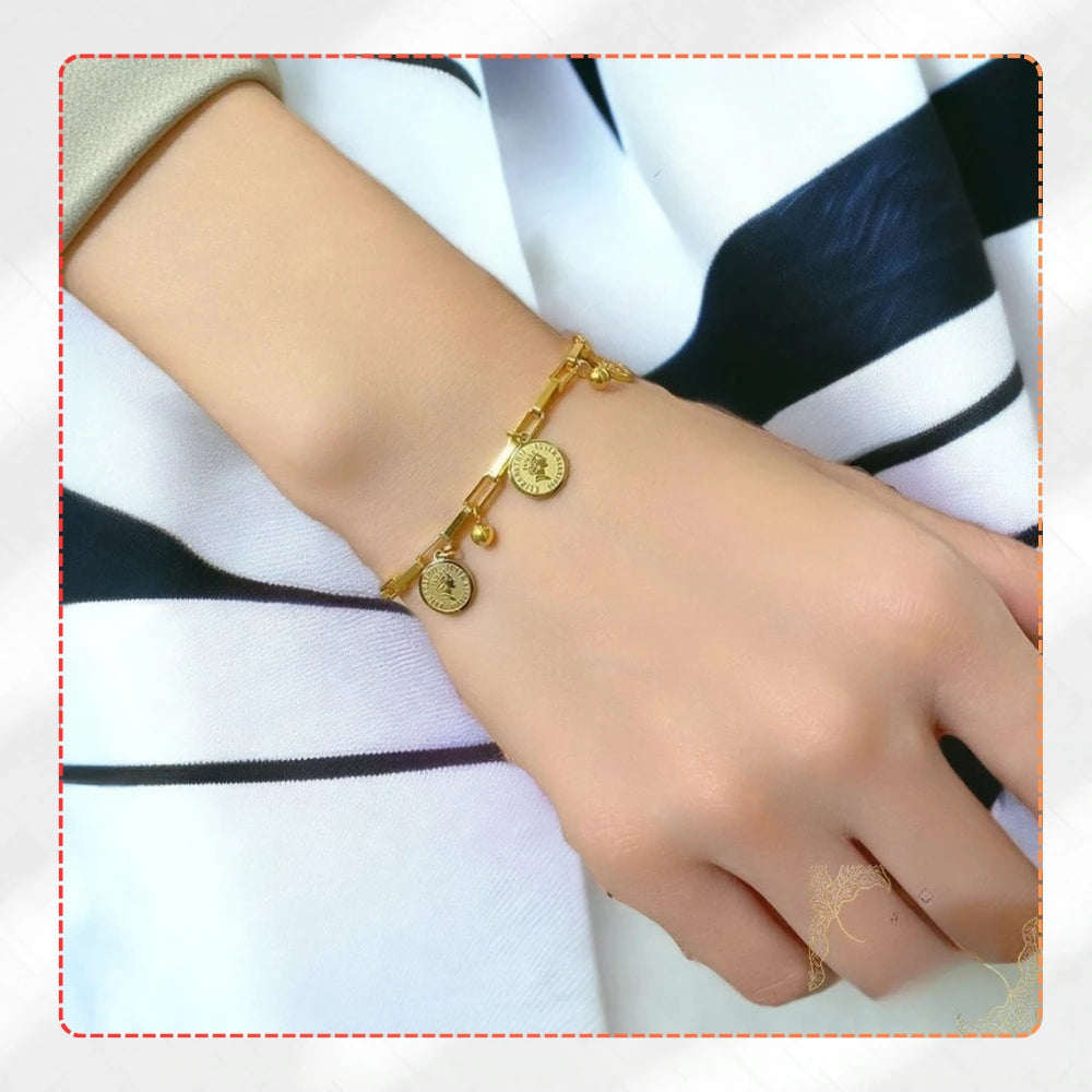 Zelta rokassprādze ar monētu kuloniem, ķirurģiskais tērauds