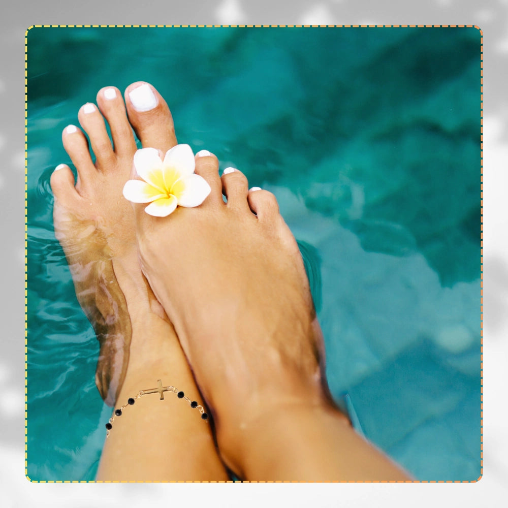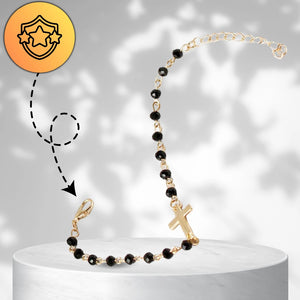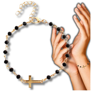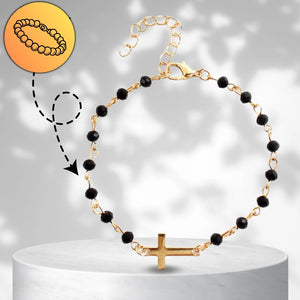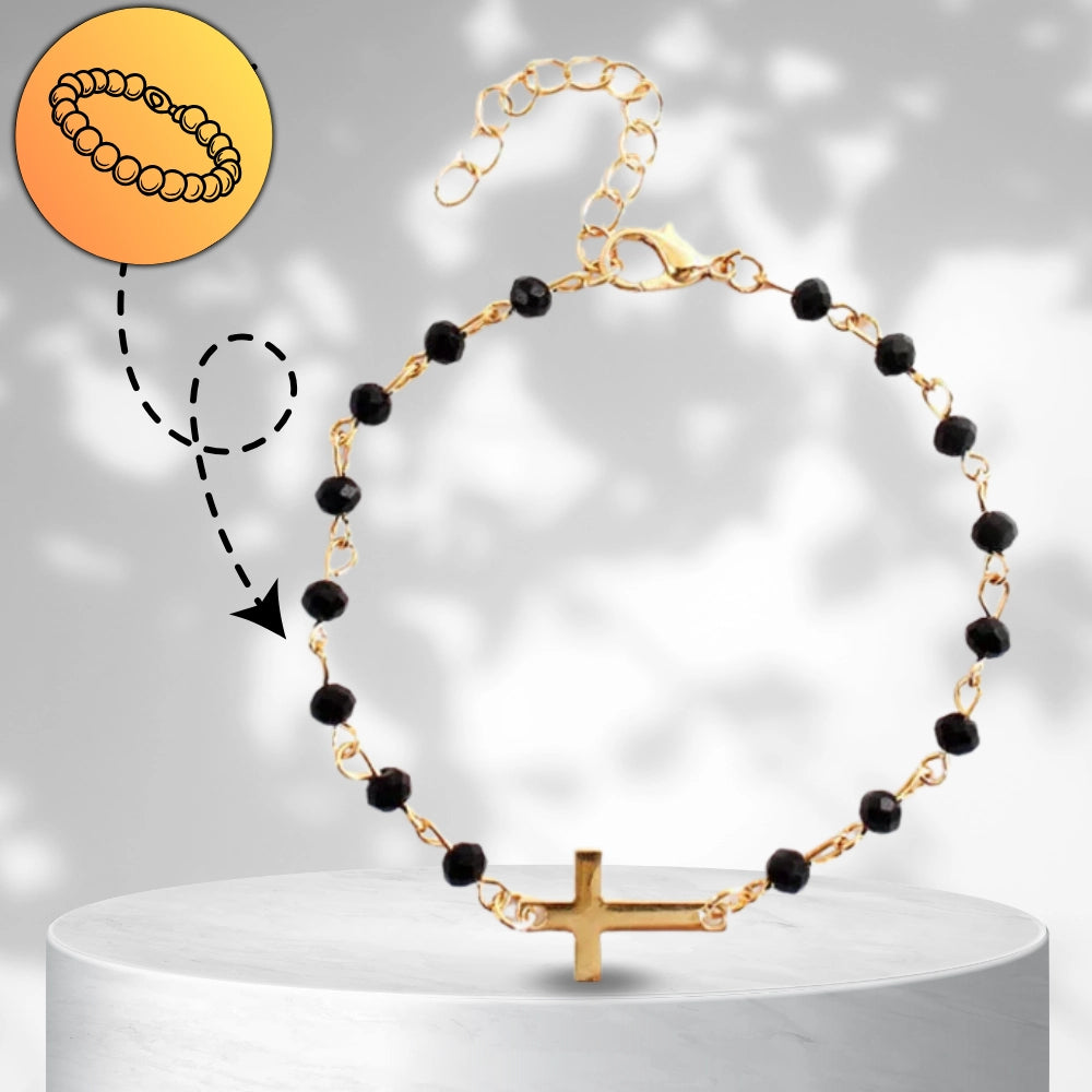 Eleganta rokassprādze, kas izgatavota no ķirurģiskā tērauda, ​​pārklāta ar 18 karātu zeltu. Melnas, spīdīgas pērlītes un krusts piešķir tai unikālu dizainu. Aproce ir izturīga pret koroziju un hipoalerģiska, tāpēc piemērota cilvēkiem ar alerģijām.