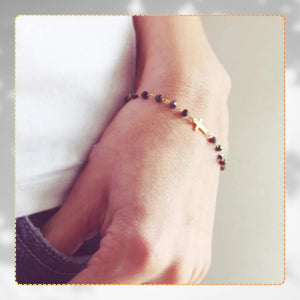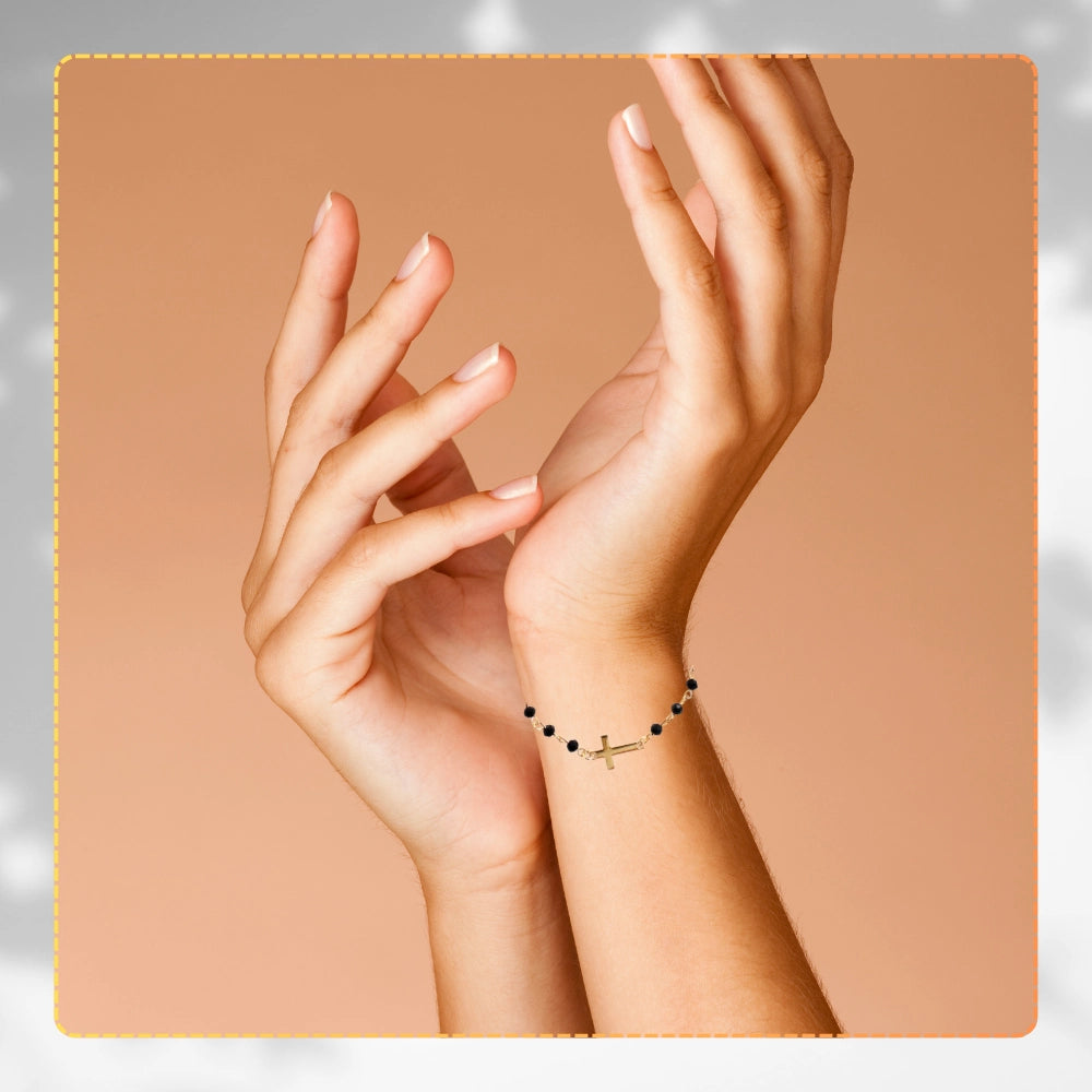 Apzeltīta rokassprādze ar melnām pērlītēm un krustu