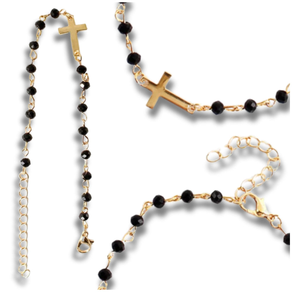 Apzeltīta rokassprādze ar melnām pērlītēm un krustu, ķirurģiskais tērauds