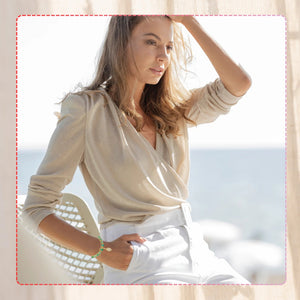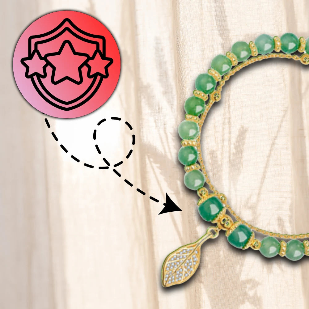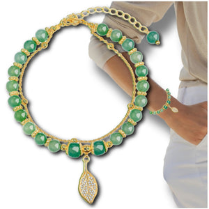 Šī dubultā aproce ar zaļām pērlītēm un kulonu zelta lapas formā ar cirkoniem piešķir eleganci un smalkumu. Aproces garums ir 16 cm, ar pagarinājumu, lai tā lieliski piegultu plaukstas locītavai. Zelta akcenti piešķir greznības pieskārienu.