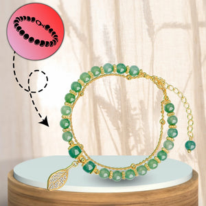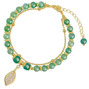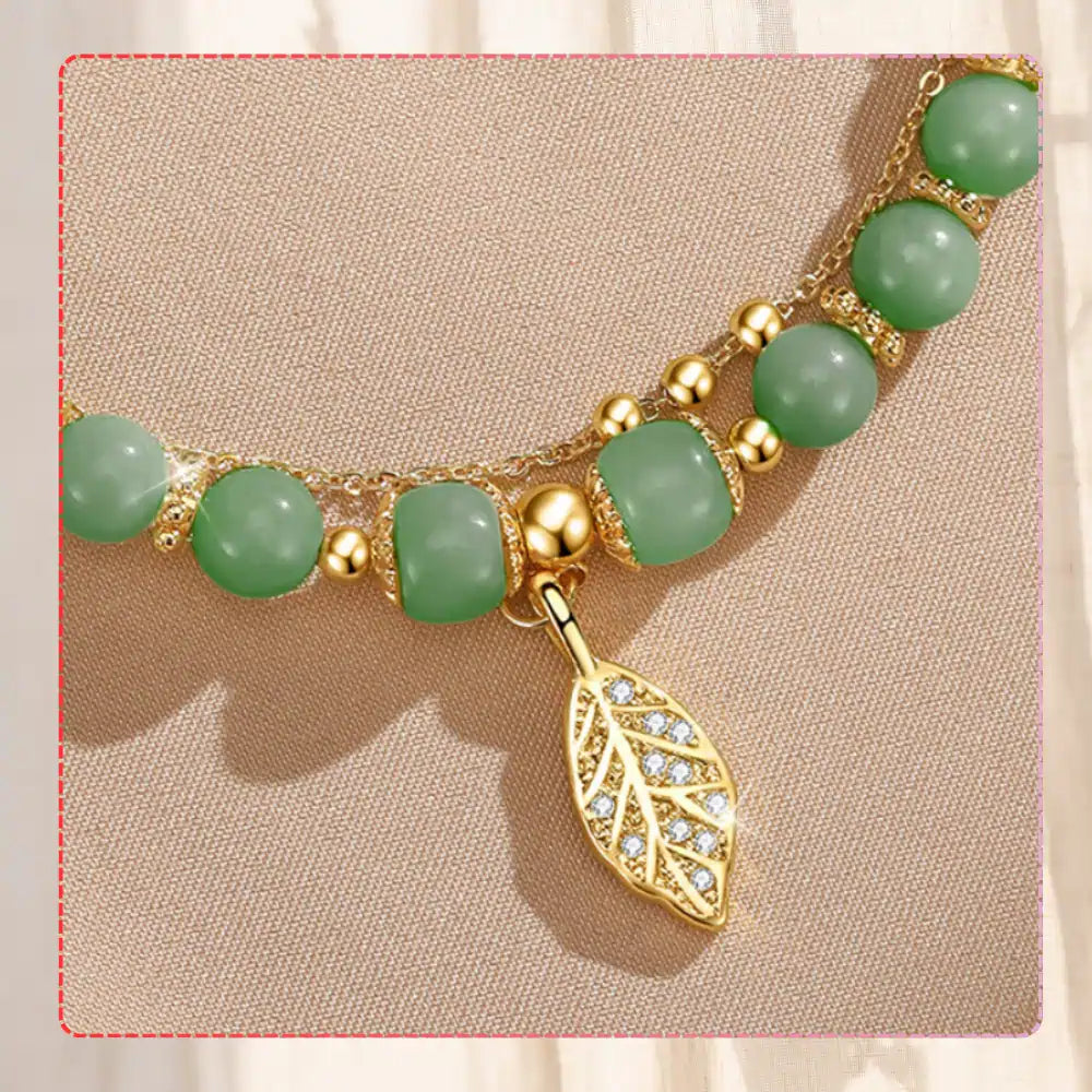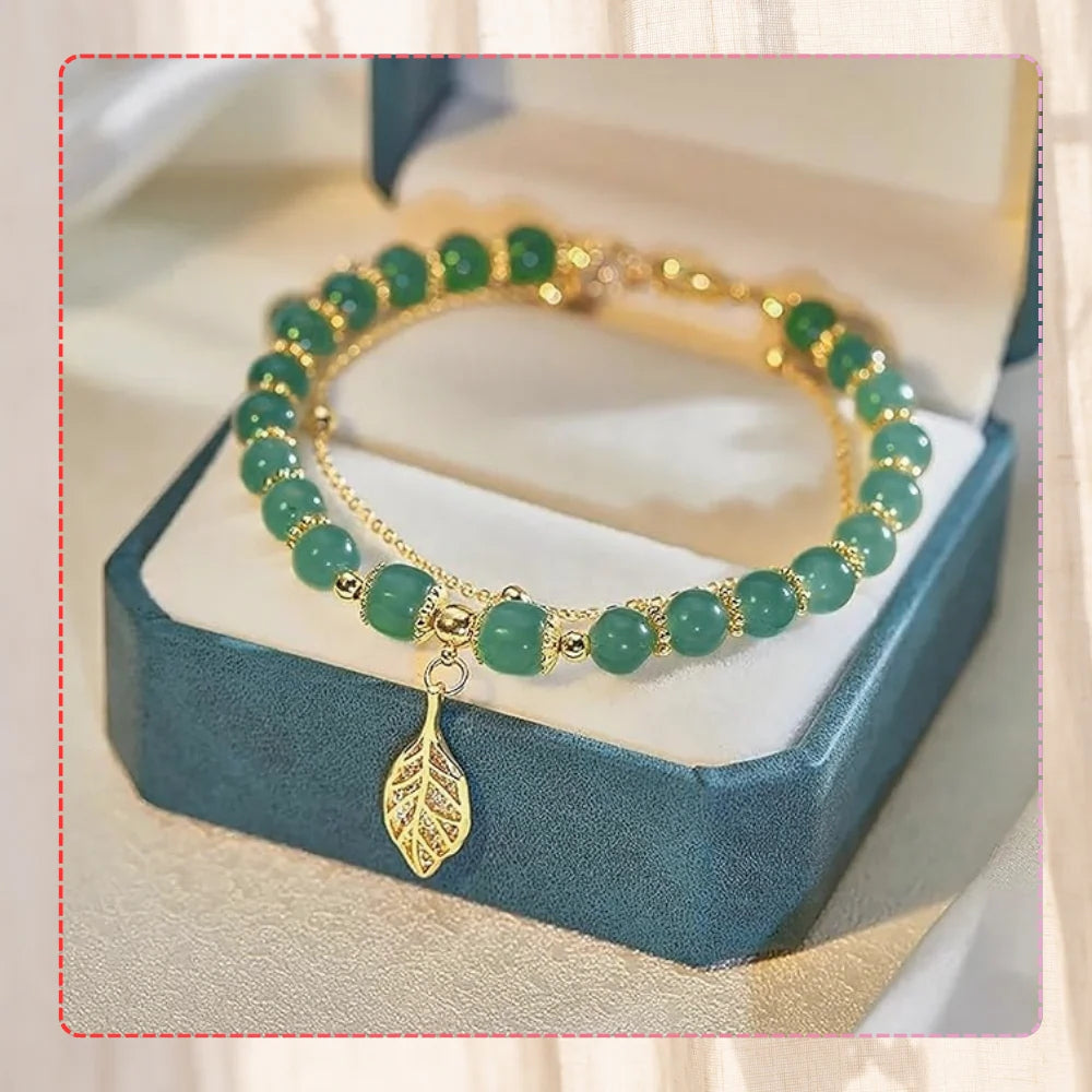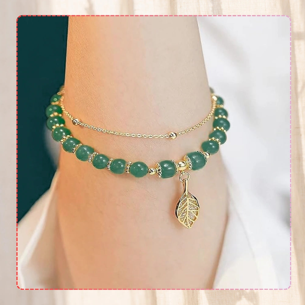 Dubultā rokassprādze ar zaļām pērlītēm un lapu kulonu