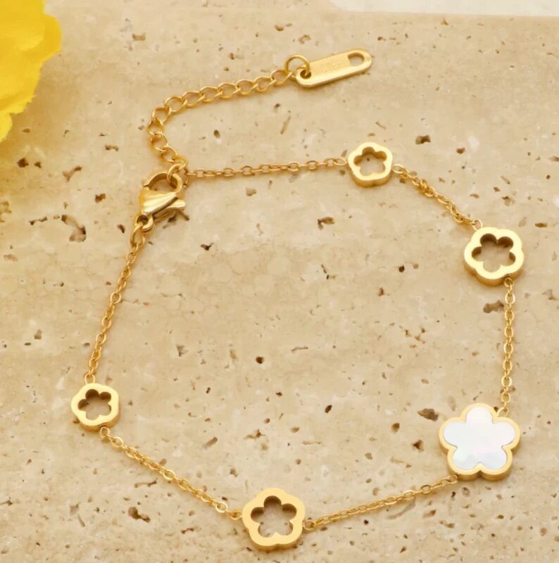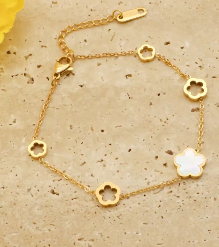 Piešķiriet savai rotaslietu kolekcijai smalku un elegantu pieskārienu ar mūsu apzeltīto ķirurģiskā tērauda aproci, kas dekorēta ar smalku baltu ziedu. Šī aproce ir perfekta moderna dizaina un nepārspējamas izturības kombinācija, kas ir ideāli piemērota gan ikdienas, gan elegantam stilam.
