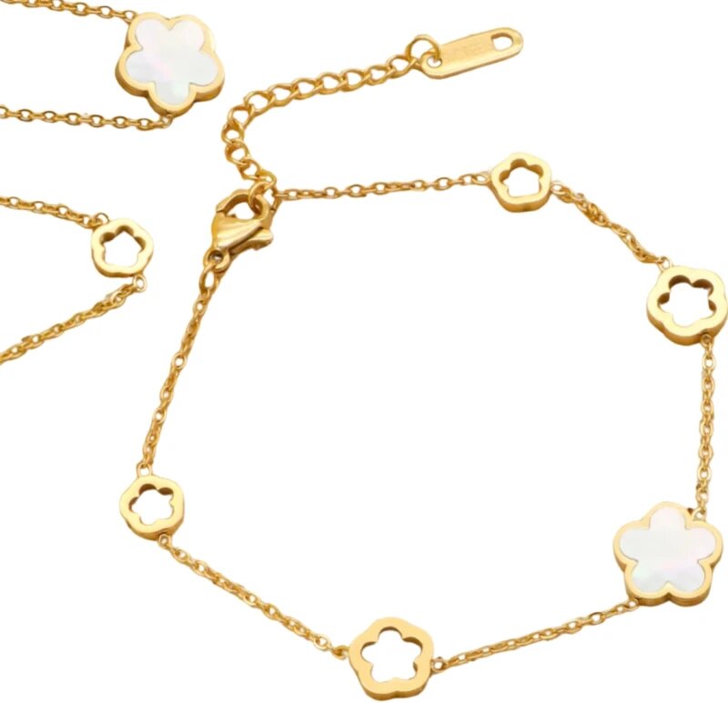 Rokassprādzes centrālais elements ir burvīgs balts zieds, kas piešķir svaigumu un smalkumu, lieliski saskaņojoties ar apzeltīto apdari. Rokassprādzes zelta krāsa apvienojumā ar balto ziedu rada harmonisku un elegantu kopumu, kas noteikti piesaistīs uzmanību.