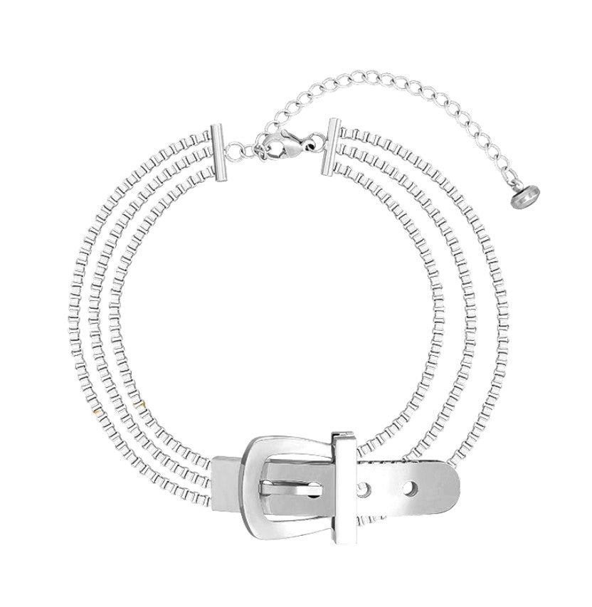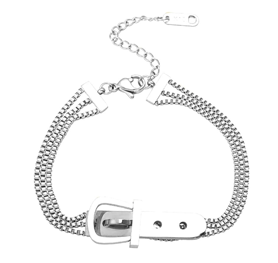 Ķirurģiskais tērauds ir izturīgs pret atmosfēras apstākļiem, nerūsē un nekļūst nespodrāks. Aproce sastāv no divām daļām, kas sastāv no trim mazām ķēdītēm, kuras savieno dekoratīvs elements, kas atgādina lielu sprādzi. Sudraba krāsa patiks sievietēm, kuras novērtē smalkas rotaslietas.