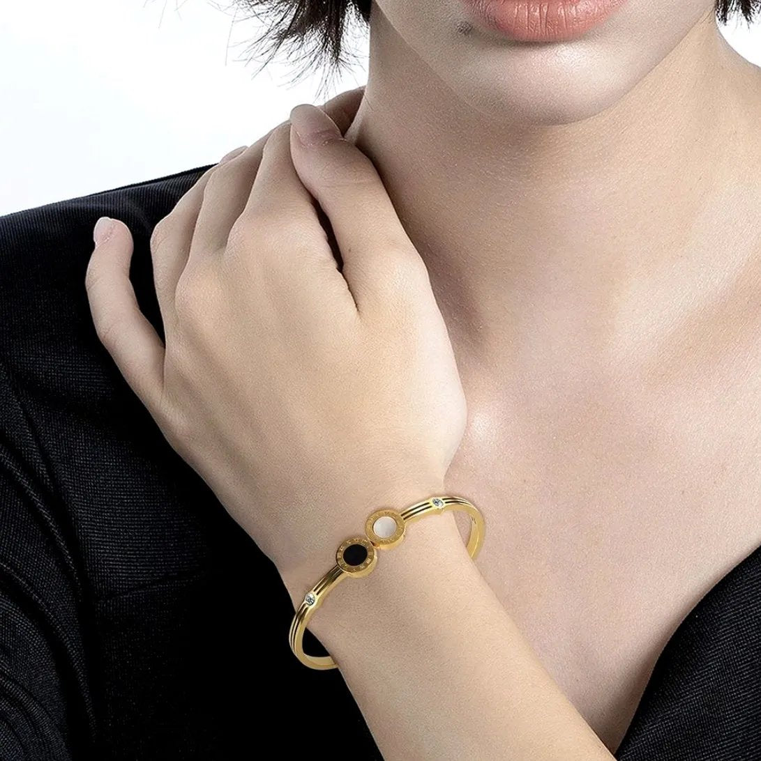 Šī elegantā rokassprādze ir izgatavota no augstas kvalitātes nerūsējošā tērauda, ​​kas ir hipoalerģisks un drošs lietošanā. Tā ir daļa no modernas ķirurģiskā tērauda rotaslietu kolekcijas, nodrošinot izturību un stilīgu izskatu.
