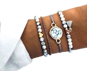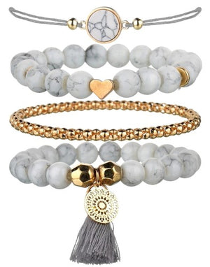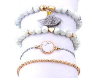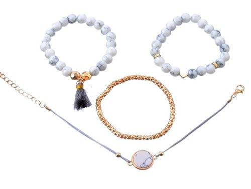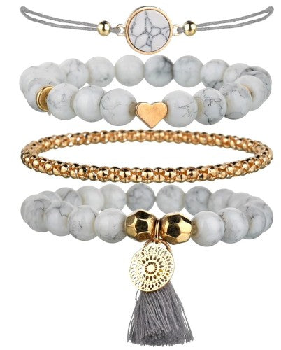 Šis rokassprādžu komplekts sastāv no četrām elegantām rokassprādzēm, kas būs lielisks papildinājums jūsu aksesuāru kolekcijai.