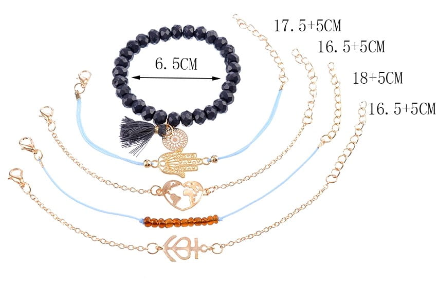 Bagātiniet savu rotaslietu kolekciju ar šo unikālo piecu rokassprādžu komplektu. Katra rokassprādze ir izgatavota no rotaslietu metāla, pērlītēm un auklas, piešķirot tām unikālu stilu un eleganci.