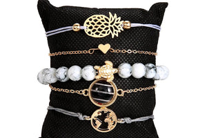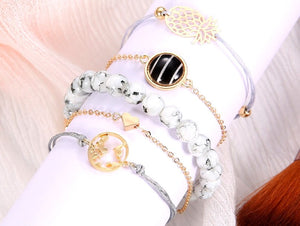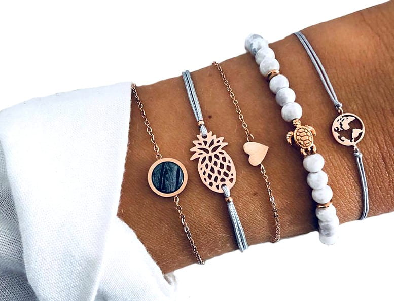 Šis elegantais sieviešu rokassprādžu komplekts C15 sastāv no piecām unikālām rokassprādzēm, kuras tiek pārdotas tikai kopā. Katra rokassprādze ir izgatavota no augstas kvalitātes rotaslietu metāla un auklas, nodrošinot izcilu stilu un komfortu.