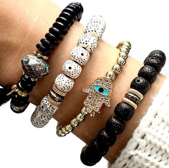 Šis rokassprādžu komplekts sastāv no 4 elastīgām un lokanām daļām, kas padara tās piemērotas dažādiem plaukstas locītavu izmēriem.