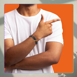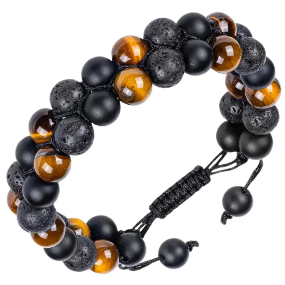 Jauna rokassprādze, kas izgatavota no dabīgiem akmeņiem - tīģera acs un vulkāniskā ieža. Koraļļa diametrs 8 mm. Diametrs 16 cm ar regulējamu aukliņu perfektai piegulšanai. Ideāli piemērota gan sievietēm, gan vīriešiem. Nes veiksmi, drosmi un aizsardzību. Lieliska dāvana jebkuram gadījumam.