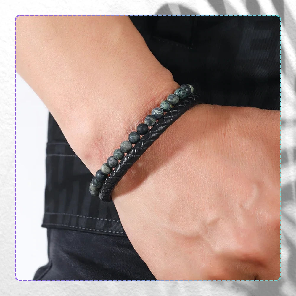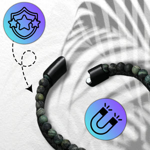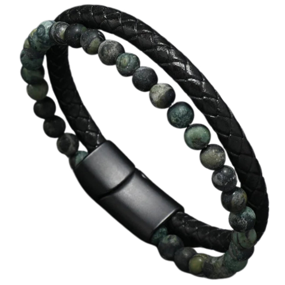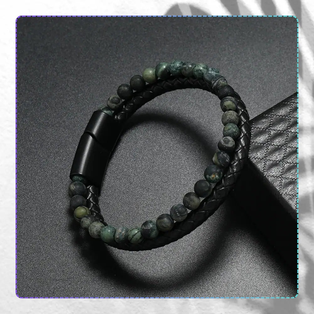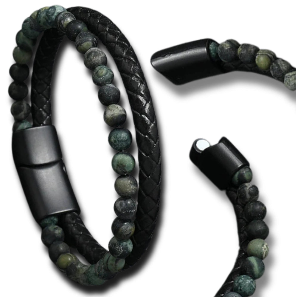 Vīriešu rokassprādze no īstas ādas un akmeņiem zaļā un melnā toņos - 21 cm ar magnētisko aizdari.