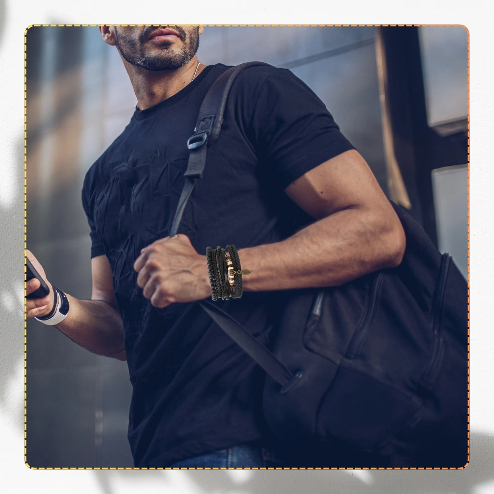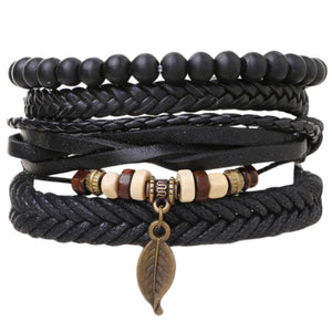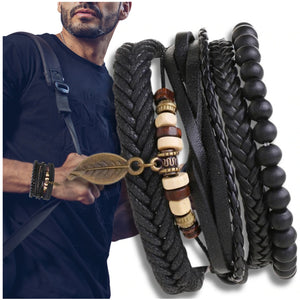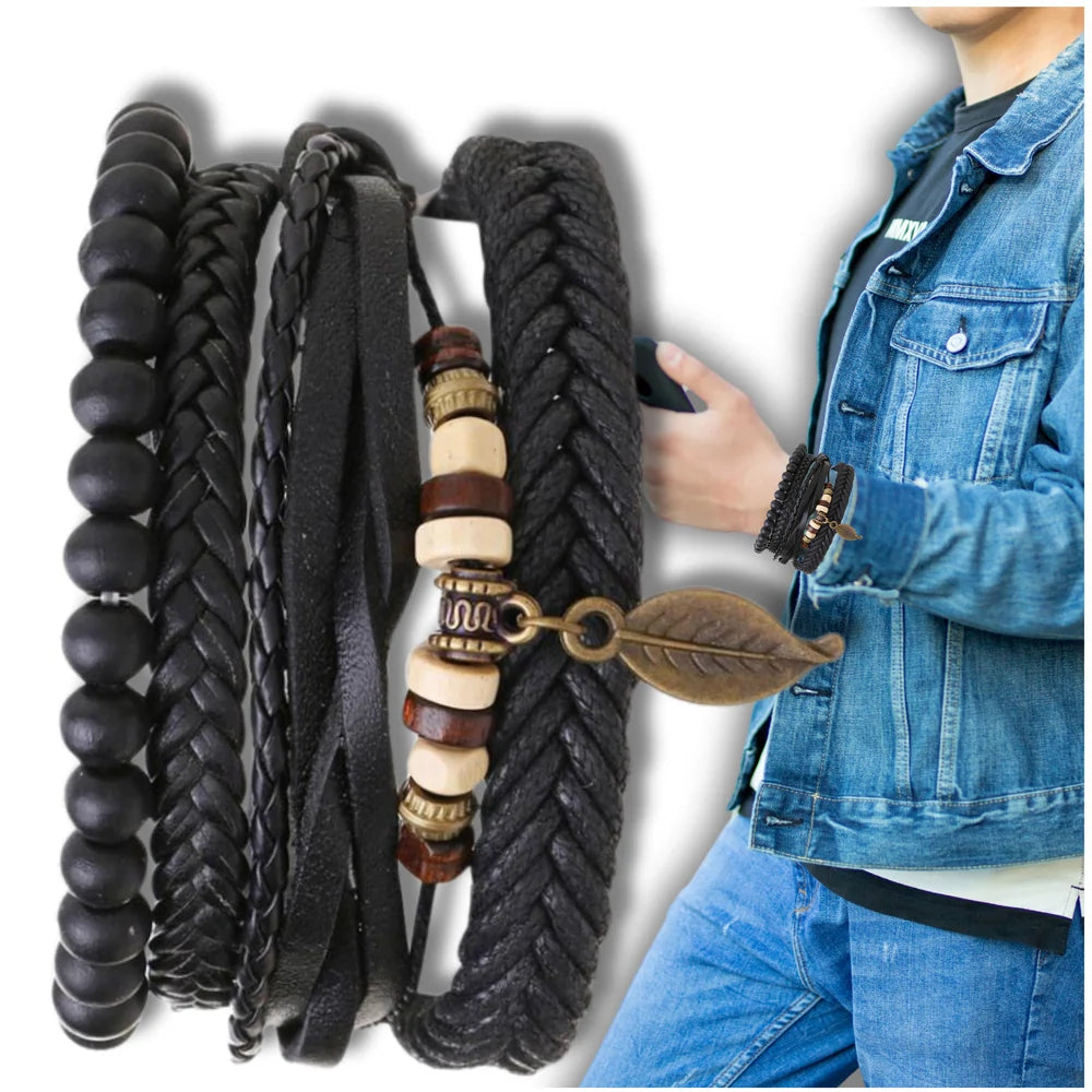 Atklājiet savu unikālo stilu ar šo vīriešu ādas aproču komplektu. Komplekts sastāv no vairākām aprocēm, kas apvieno organiskās ādas elementus, pērlītes un dekoratīvu lapas formas kulonu, piešķirot visam unikālo un dabisko raksturu.