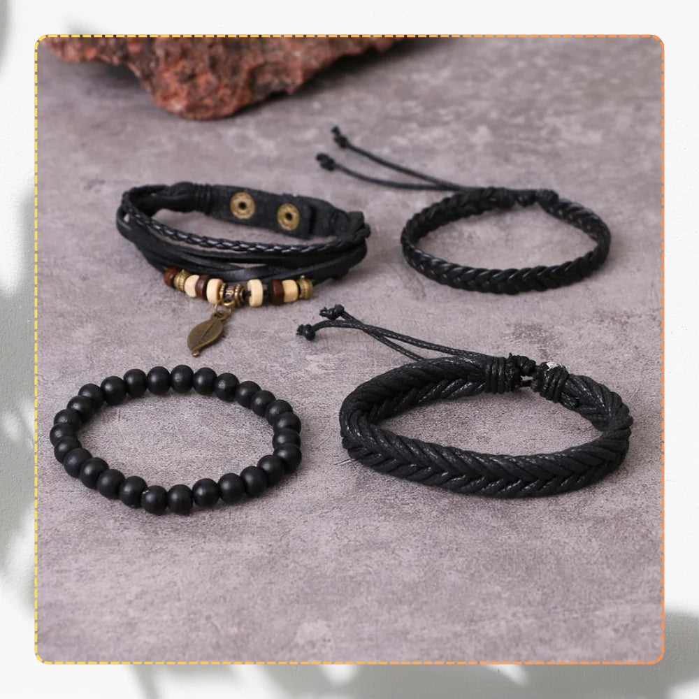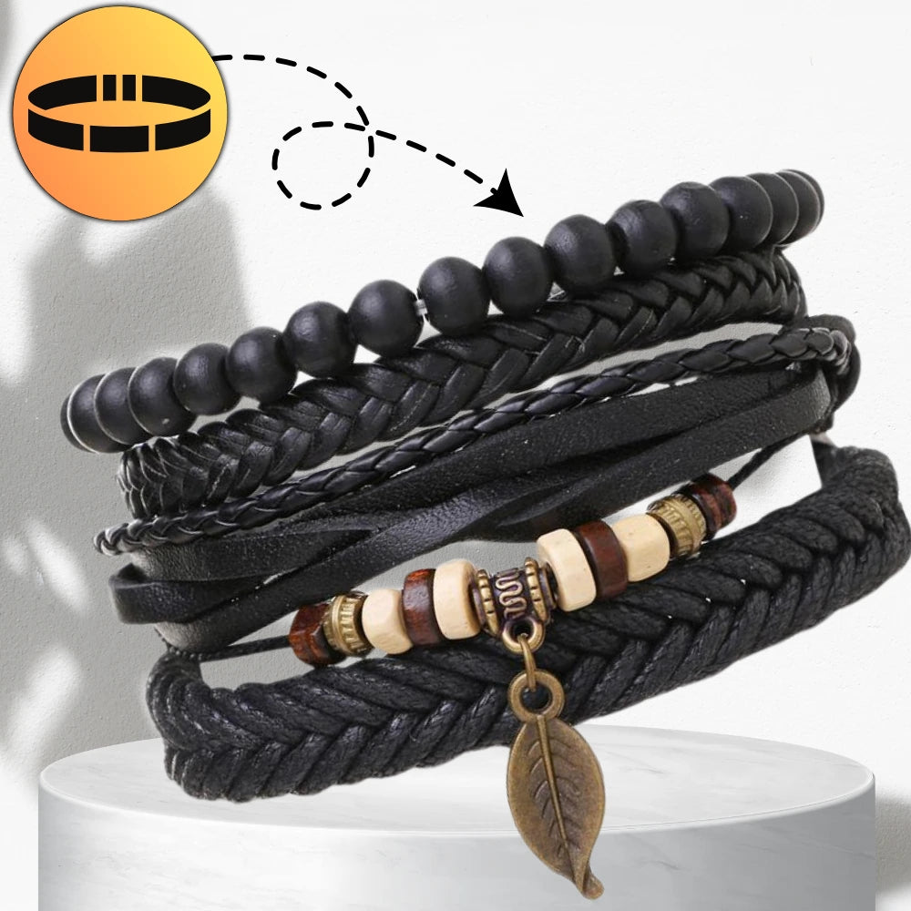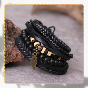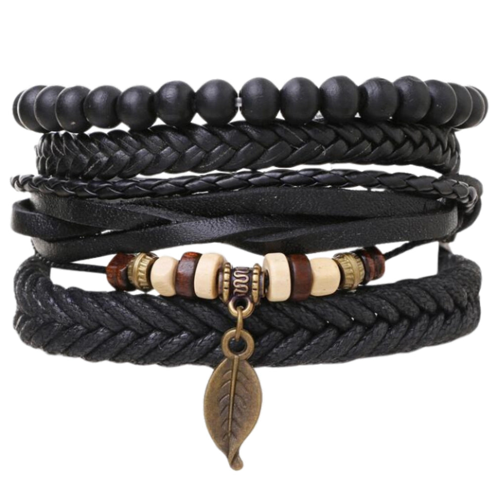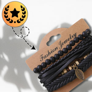 Rokassprādzes ir 25 cm garas un regulējamas ar aukliņām, tāpēc tās viegli pieguļ plaukstas locītavai un ir ērtas valkāšanai visu dienu. To daudzslāņu dizains ļauj tās valkāt kopā vai atsevišķi, pielāgojot stilu gadījumam. Komplektā ietilpst pītas ādas siksniņas, melnas pērlītes un dekoratīvi elementi dabīgās krāsās, kas lieliski saskan viens ar otru. Šī komplekta centrālais akcents ir lapas formas kulons, kas rotaslietai piešķir smalku, dabisku akcentu.