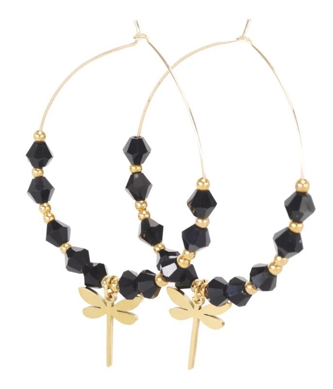 Šie elegantie auskari ir apaļas formas, 4,5 cm diametrā. Tie ir dekorēti ar smalkām melnām pērlītēm un burvīgu spāres motīvu, kas piešķir tiem unikālu un stilīgu izskatu. Lieliski piemēroti gan ikdienai, gan vakaram.