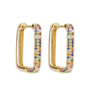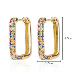 Šie elegantie, apzeltītie taisnstūra formas auskari ir lieliska izvēle tiem, kas novērtē smalku stilu un krāsainus akcentus. Auskari ir dekorēti ar krāsainiem cirkoniem, kas piešķir tiem unikalitāti un šarmu.