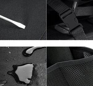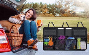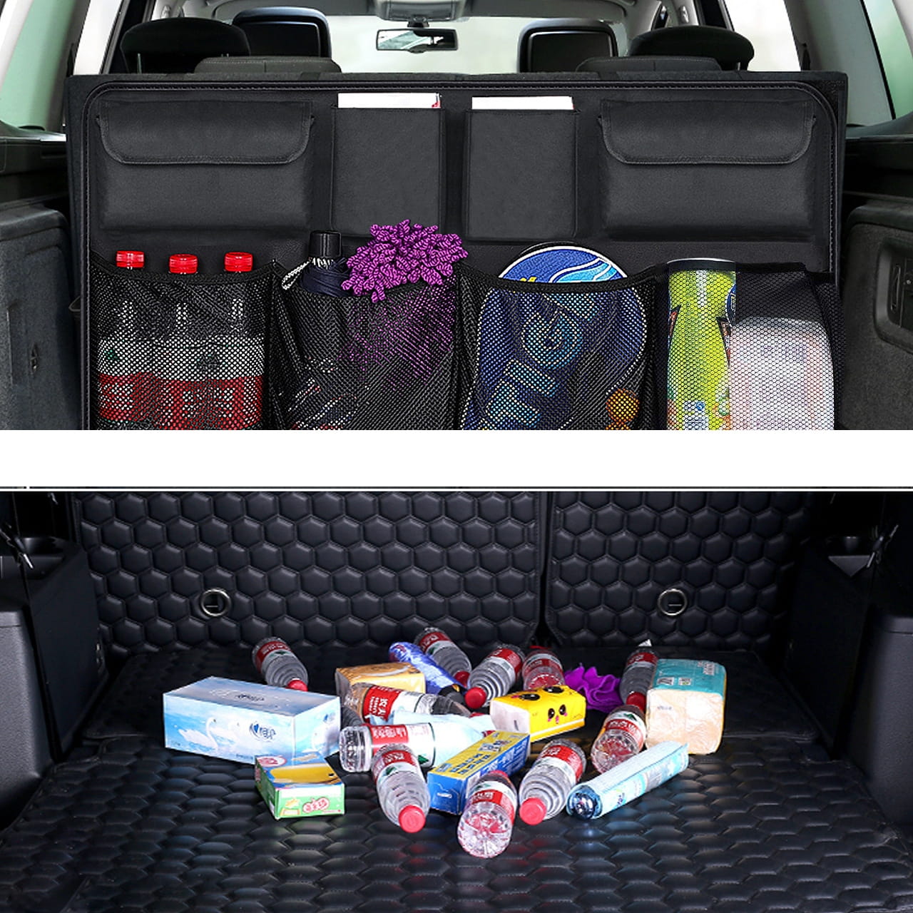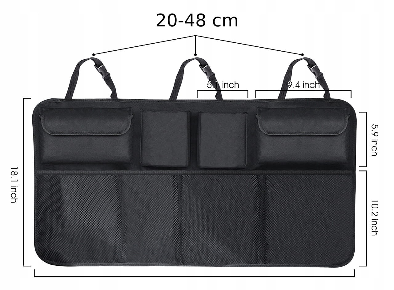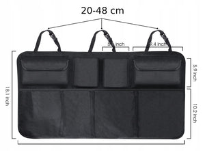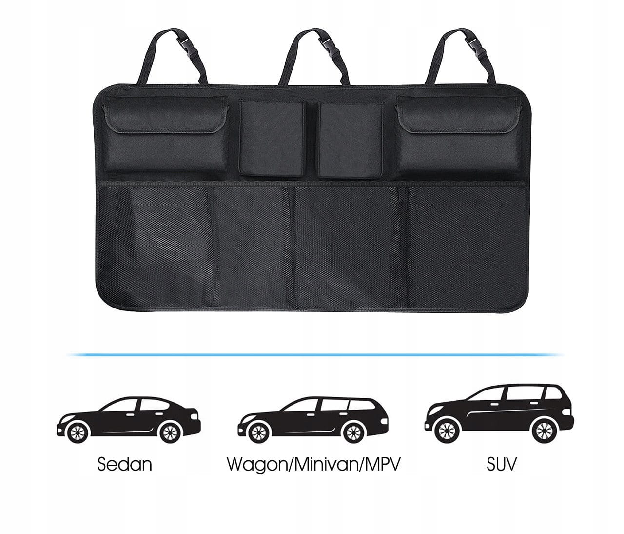 Trīskāršs automašīnas paplāte un organizators bagāžniekam. Ideāls regulējams ūdensnecaurlaidīgs paplāte un organizators jūsu automašīnas aizmugurējiem sēdekļiem. Aizmirstiet par nekārtību bagāžniekā! Lieliski piemērots gan ceļojumiem, gan ikdienas lietošanai. Bojājumiem izturīgs ūdensnecaurlaidīgs audums, regulējami (20–54 cm) 3 punktu galvas balsta stiprinājumi. Universāli izmēri, kas piemēroti gan lieliem apvidus auto, gan mazākām kompaktajām automašīnām. Stiprinājumi ar regulējamām skavām. 8 ietilpīgi nodalījumi, kas piemēroti jebkuram ceļojumam.